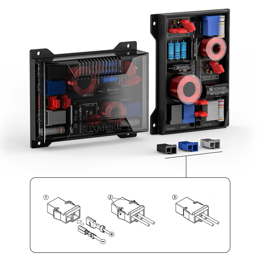 Standaard worden de BXS 2.3 crossovers geleverd in elegante, rookgrijs transparante behuizingen. Indien nodig is het mogelijk om het filter op te delen in twee losse delen; één filter voor de (mid)woofer en één voor de tweeter. Daartoe wordt de printplaat uit de behuizing gehaald en kunnen de losse filters veilig en compact als in-line filter gemonteerd worden door ze in de meegeleverde krimpkous hulzen te plaatsen.