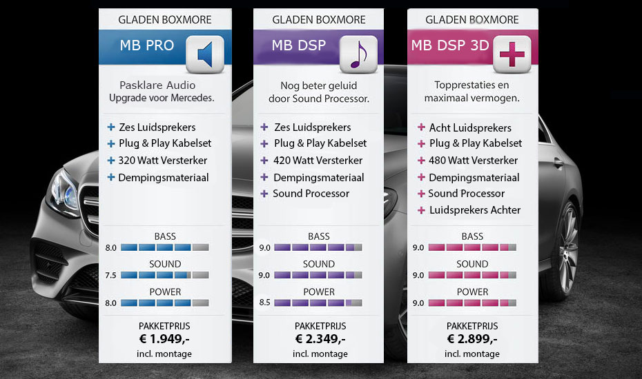 Elk BOXMORE audio pakket wordt compleet geleverd met pasklare luidsprekers, versterker, kabelboom en dempingsmateriaal. Gemaakt voor uw Mercedes en daardoor relatief snel te monteren, zonder ingrijpende aanpassingen aan uw auto. Hierdoor bespaart u op de kosten voor de montage en bent u verzekerd van het optimale resultaat.