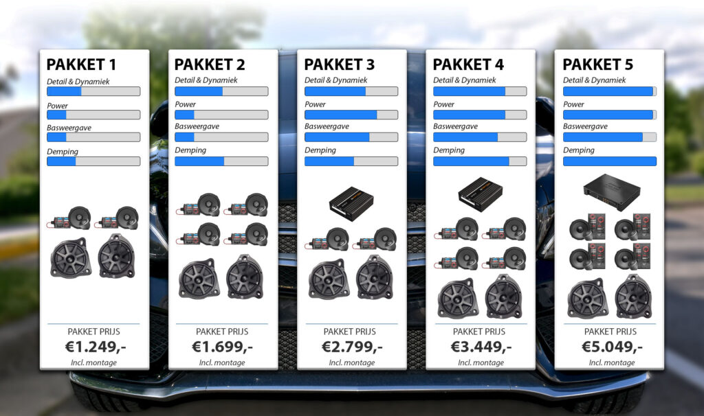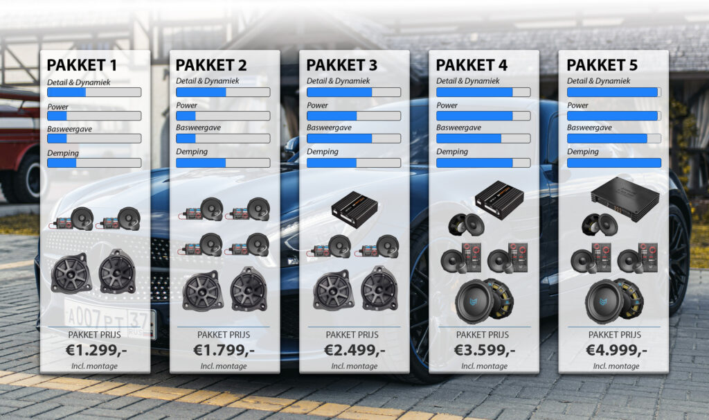 Kies voor een van bovenstaande pakketten inclusief montage en 3-laags demping en geniet weer van muziek in uw auto.
