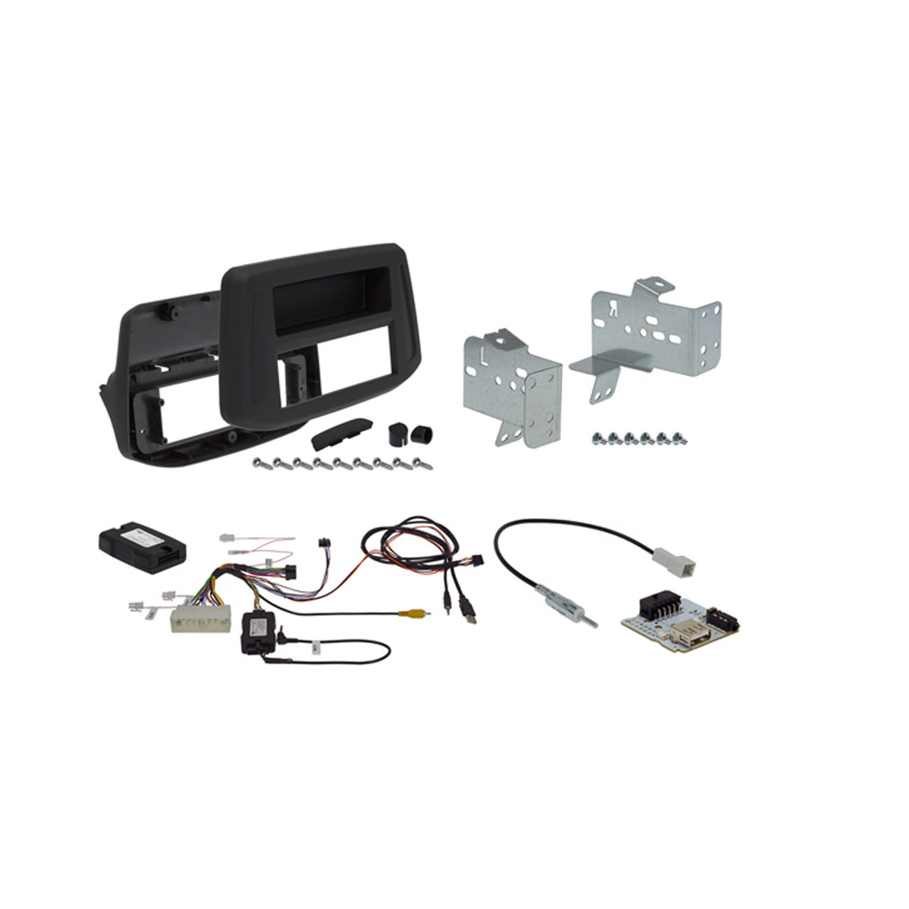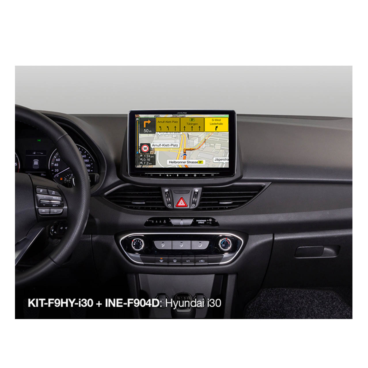 The KIT-F9HY-i30 includes a custom-fit frame, wiring harness with CAN interface and an antenna adapter. The CAN interface retains usage of the steering wheel remote control buttons.