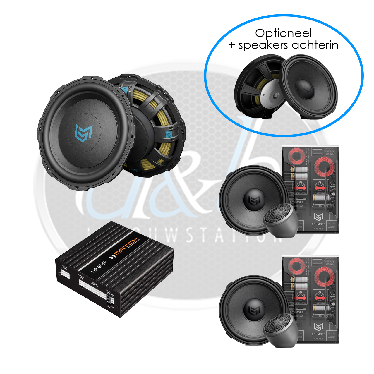 Wil je graag nog meer/hardere lage tonen, dan kunnen we natuurlijk ook een subwoofer toevoegen. Kom daarvoor langs of bel ons voor meer informatie over de mogelijkheden.