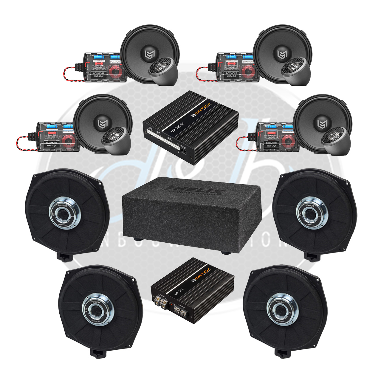 Dit premium pakket biedt niet alleen een zuiver en dynamisch geluid, maar ook extra demping voor een ultieme luisterervaring. De combinatie van hoogwaardige 3-weg premium speakers in zowel de voor- als achterdeuren, samen met de krachtige 840Watt RMS 10-kanaals DSP versterker, garandeert een audio-ervaring van topklasse. Als kers op de taart voegen we een 300W RMS 10 inch subwoofer met monoblock toe, voor een diepe en krachtige basweergave.
