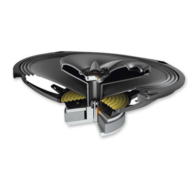 Ideale constructie van de tweeter in het centrum van de conus. Hierdoor is er geen verschuiving van de tijden van de verschillende frequenties. Hierdoor klinkt de coaxiaal speaker heel neutraal en zuiver.