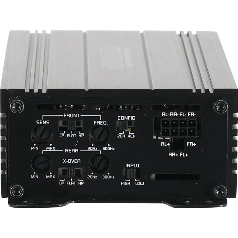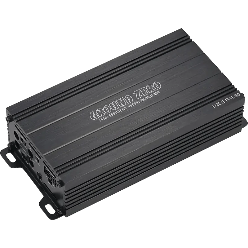 4-kanaalsversterker met kleine afmetingen, geïntegreerde actieve crossover en auto-on-functie Micro 4-kanaalsversterker |