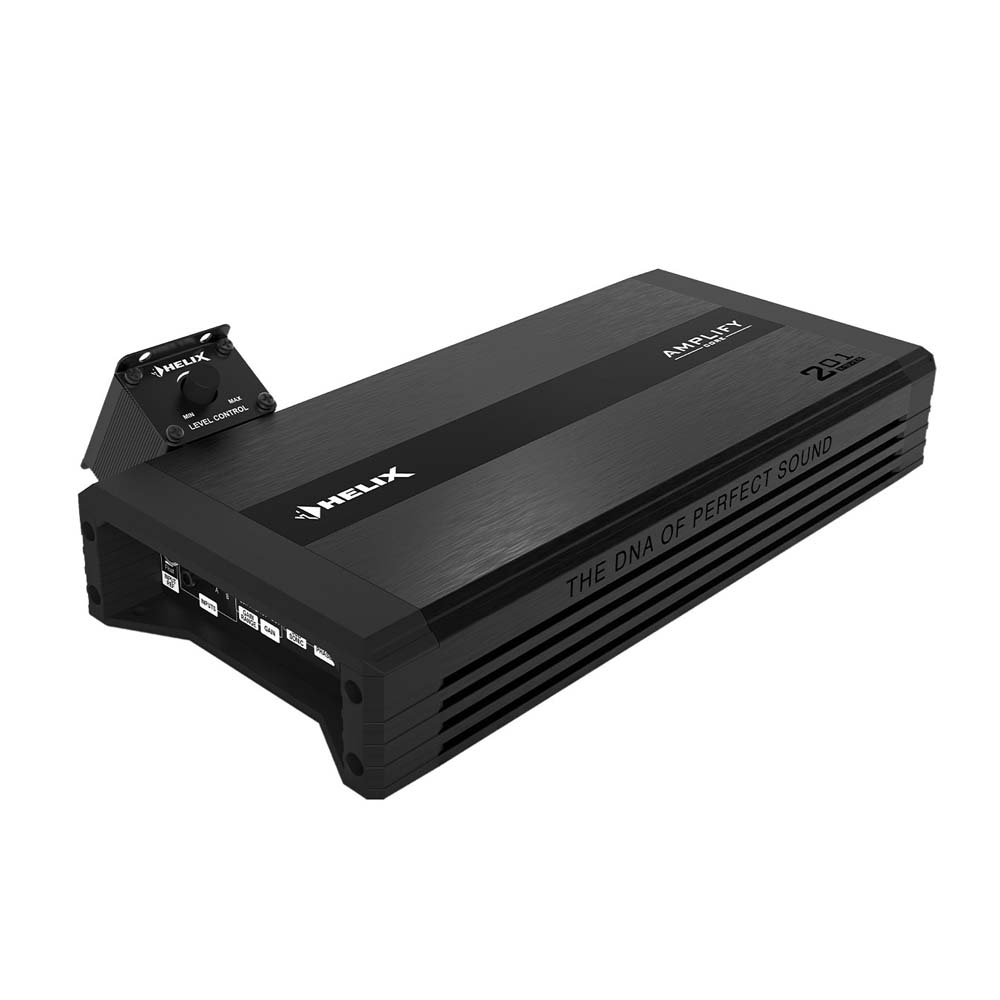 Het ontwerp van de HELIX AMPLIFY 2-Series combineert technische finesse met een strak, modern uiterlijk. De compacte behuizing maakt installatie mogelijk in zelfs de kleinste ruimtes. Alle aansluitingen en bedieningsknoppen zijn verborgen achter een afneembaar bovenpaneel, wat zorgt voor een strakke afwerking en extra bescherming. De matte oppervlakken, scherpe lijnen en minimalistische uitstraling onderstrepen het hoogwaardige karakter – perfect passend in elk modern voertuiginterieur.
