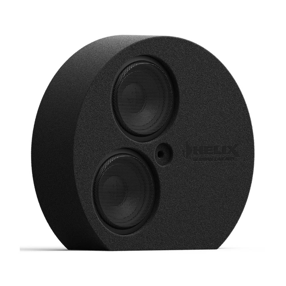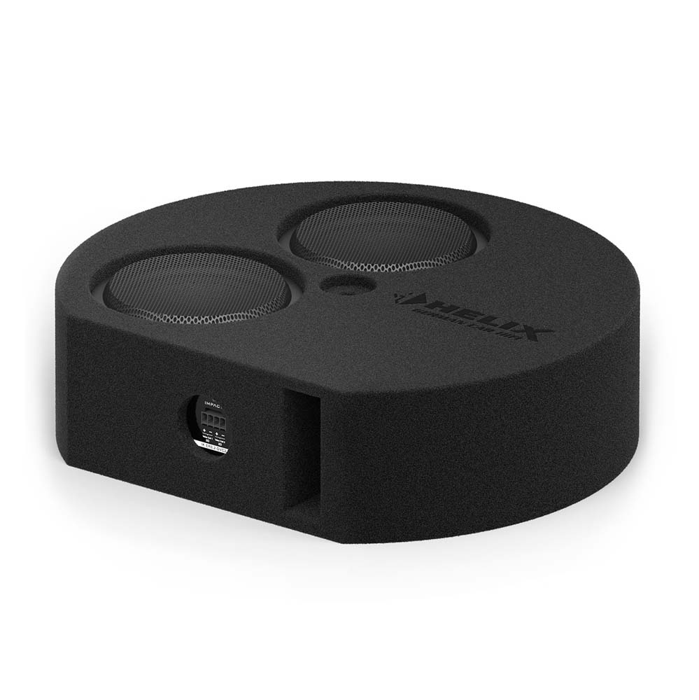 De subwoofers zijn verzonken gemonteerd, wat zorgt voor een strak, ruimtebesparend design en extra bescherming. De stevige behuizing is bekleed met tapijt en voorzien van een geborduurd HELIX-logo, wat niet alleen stijlvol is maar ook de duurzaamheid van de unit versterkt. Het meegeleverde montagemateriaal zorgt ervoor dat de subwoofer veilig in de reservewielruimte wordt vastgezet.